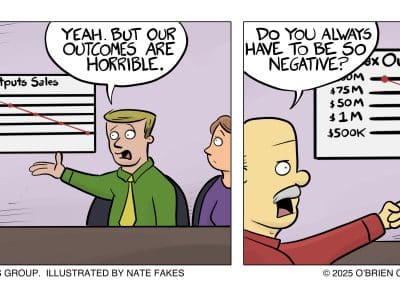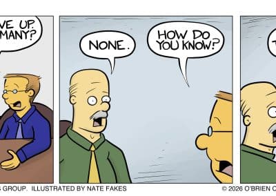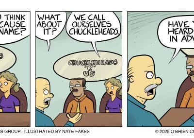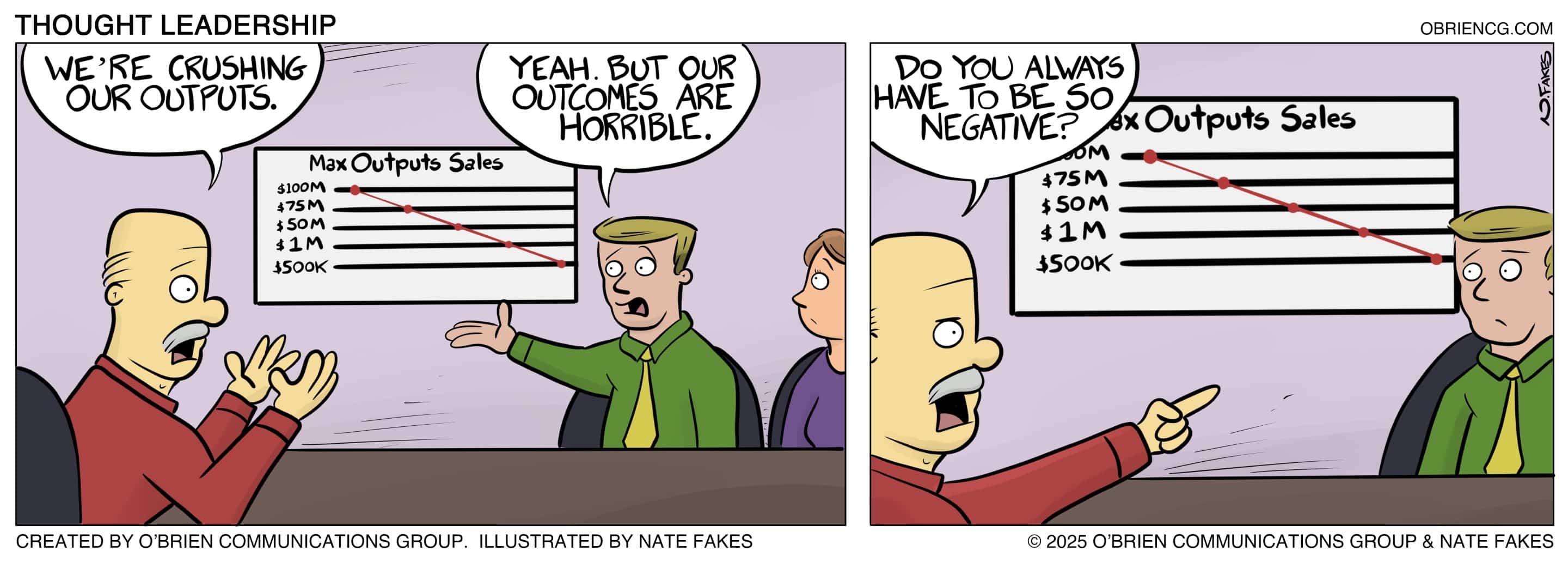 Grandpa O’Brien loved to say, “Charity begins at home.” So, we used BizComics — and co-creator Nate Fakes, a nationally syndicated cartoonist — to develop a strip that would help differentiate us and our creative services from would-be competitors. Thought Leadership was born.