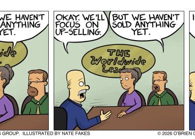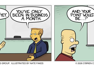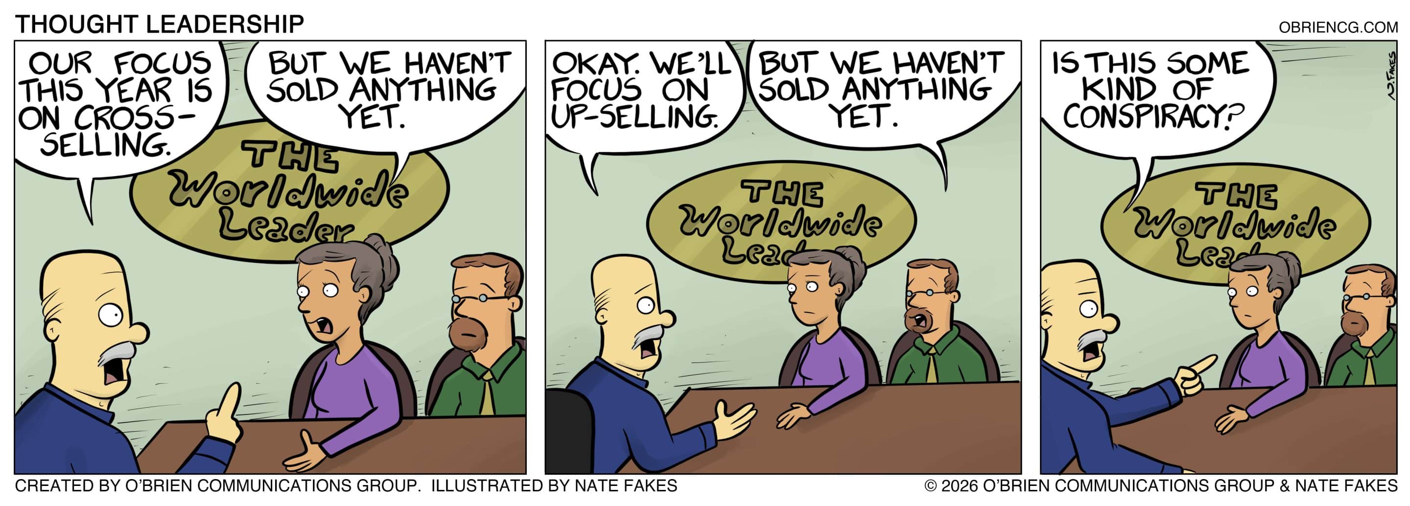 Grandpa O’Brien loved to say, “Charity begins at home.” So, we used BizComics — and co-creator Nate Fakes, a nationally syndicated cartoonist — to develop a strip that would help differentiate us and our creative services from would-be competitors. Thought Leadership was born.